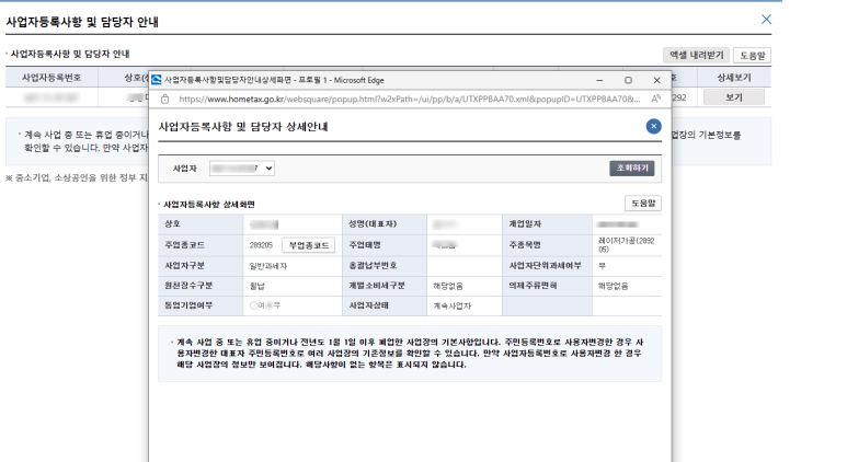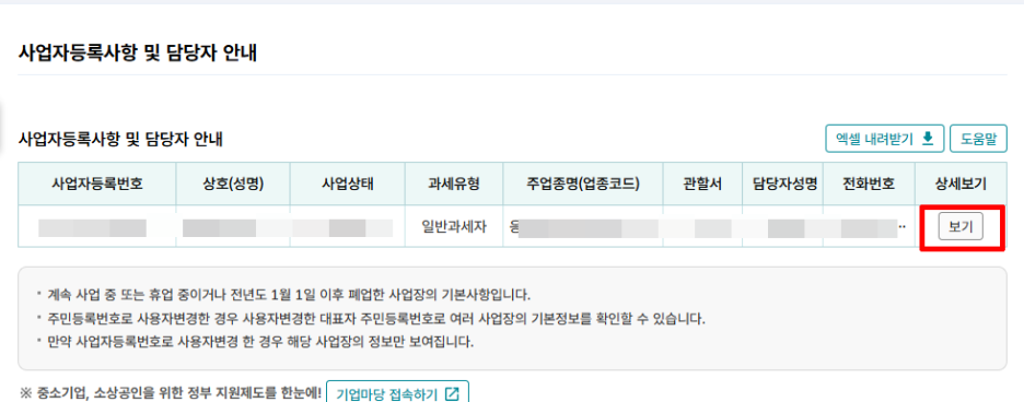 사업자등록사항 및 담당자 안내 → '보기'를 클릭하면 사업자등록사항 및 담당자 상세안내가 확인됩니다.