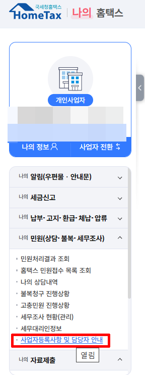 민원 → ' 사업자등록사항 및 담당자 안내'를 클릭해 줍니다.