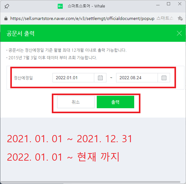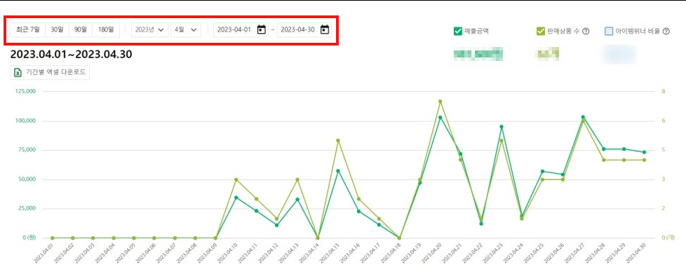 해당 기간을 설정하신 뒤, 매출 금액이 조회될 수 있도록 검색 버튼을 눌러 주시기 바랍니다.