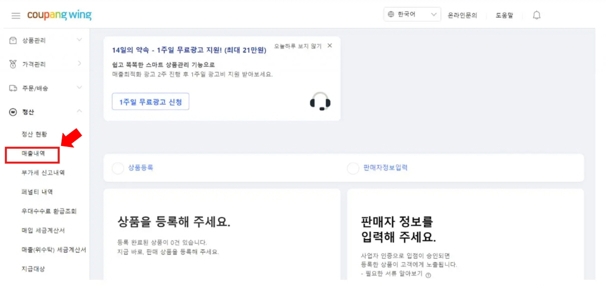 쿠팡 로그인 > 좌측 메뉴 [정산] > [매출내역] 클릭