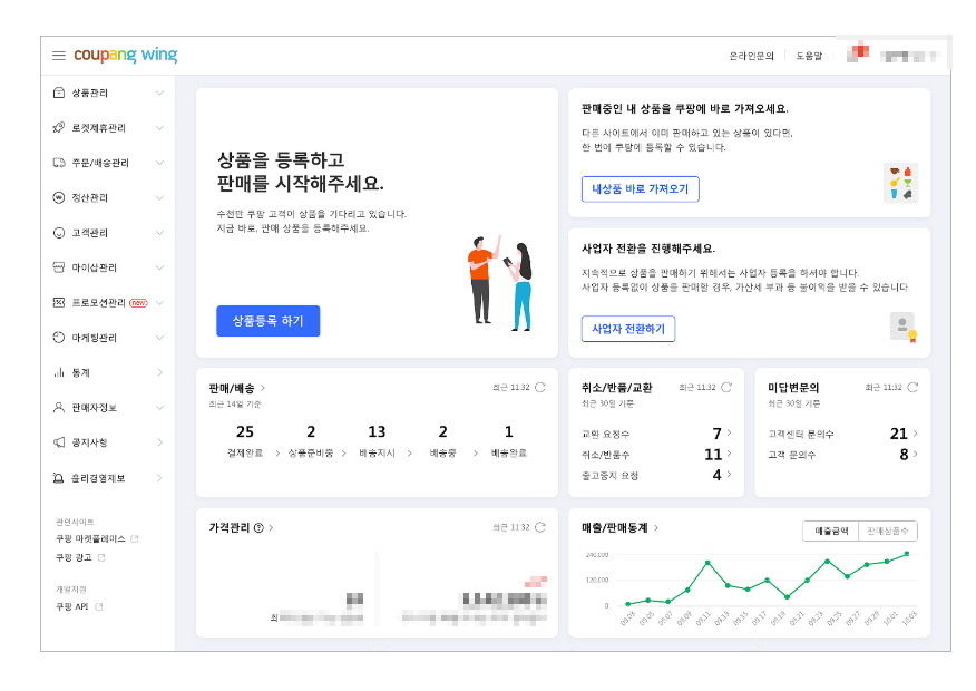 쿠팡 판매자 계정으로 로그인하신 뒤, [쿠팡 판매자센터(WING)]에 접속해 주세요.
