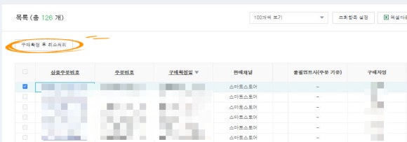 해당 주문건 앞에 V 구매확정 후 취소처리 클릭