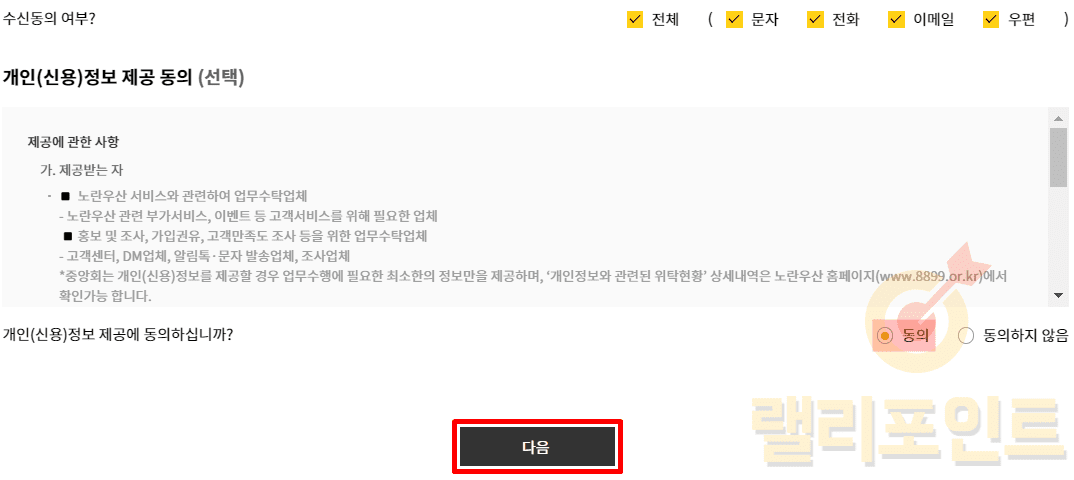 9. 개인 정보 제공에 동의 후 다음을 누릅니다.