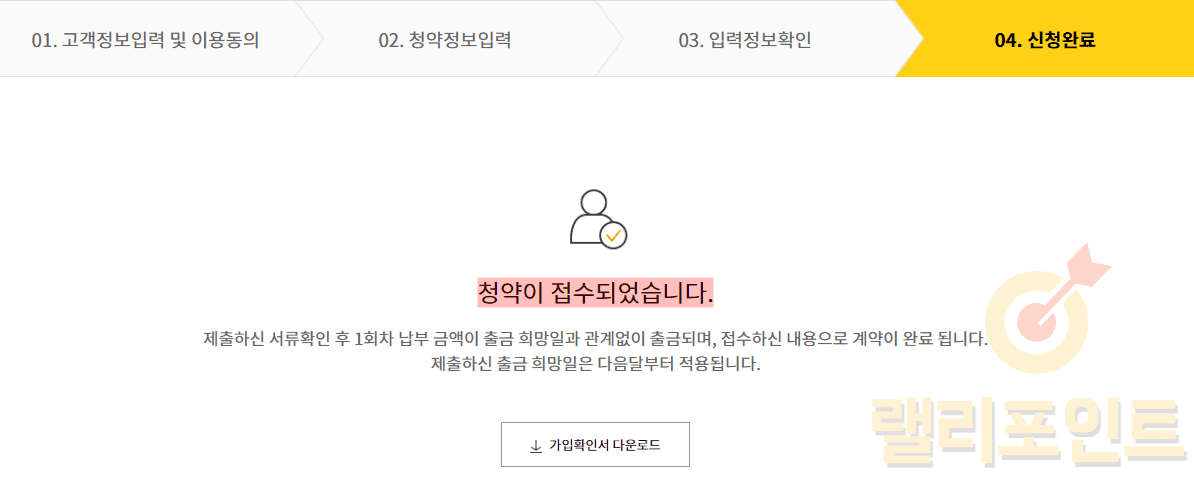 제출한 신청서류를 확인 후 1회차 납부 금액은 출금 희망일과 관계없이 곧바로 출금되며, 접수한 내용으로 계약이 완료됩니다. 제출한 출금 희망일은 다음달부터 적용되니 주의하시길 바랍니다.