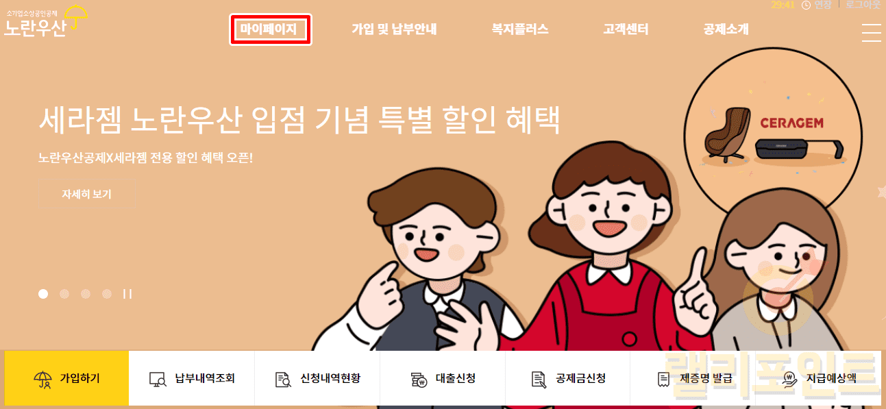 1. 노란우산공제에 로그인 후 마이페이지를 클릭합니다.