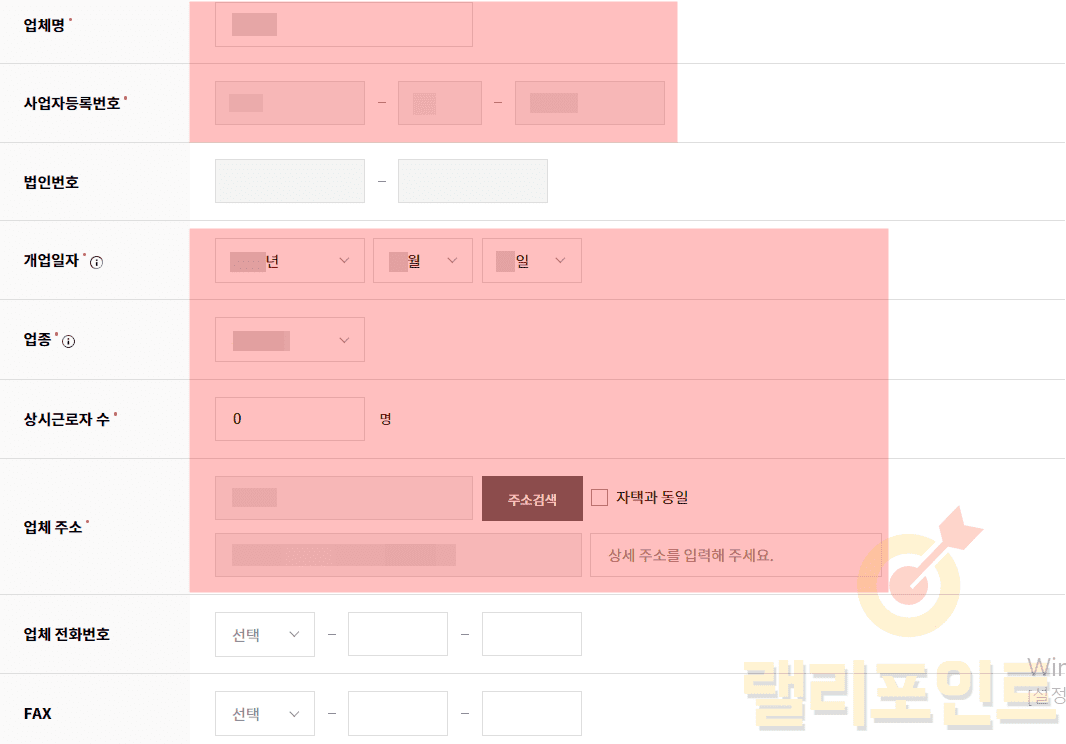 5. 업체명, 사업자등록번호, 개업일자, 업종, 상시근로자수, 업체주소를 기입합니다.