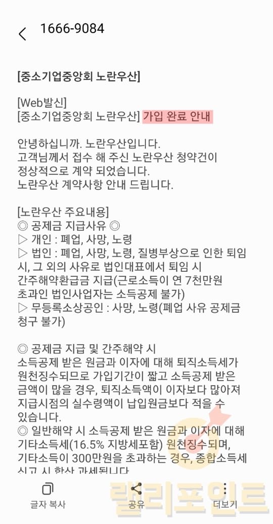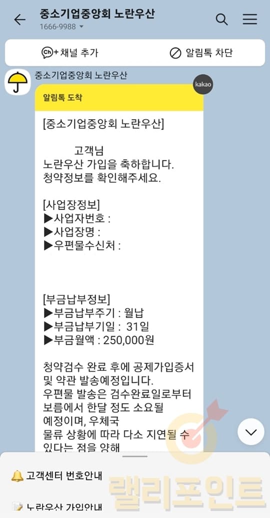 노랑우산공제에서 걸려온 전화를 받으신 후 모든 확인이 끝나시면 위와 같이 노랑우산 가입 완료 안내 문자를 받으실 수 있습니다. 이곳에서 노랑우산에 관련된 주요 내용을 모두 확인하실 수 있습니다. (가입과 동시에 청약부금이 바로 출금됩니다.)