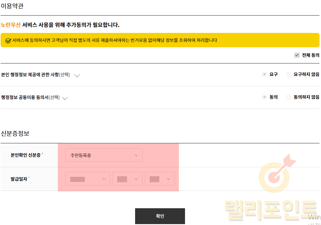7. 이용약관에 전체 동의한 후 신분증 정보에서 발급일자를 기입합니다.