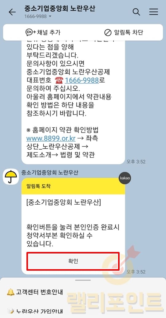 카카오톡에서도 위와 같이 노란우산공제에서 메시지를 보내주게 되는데 이곳에서 나의 사업장정보, 부금납부정보 등을 확인할 수 있습니다. 또한 청약서를 다시 한번 볼 수 있는데 본인인증 메시지에서 확인 버튼을 클릭해보시길 바랍니다.