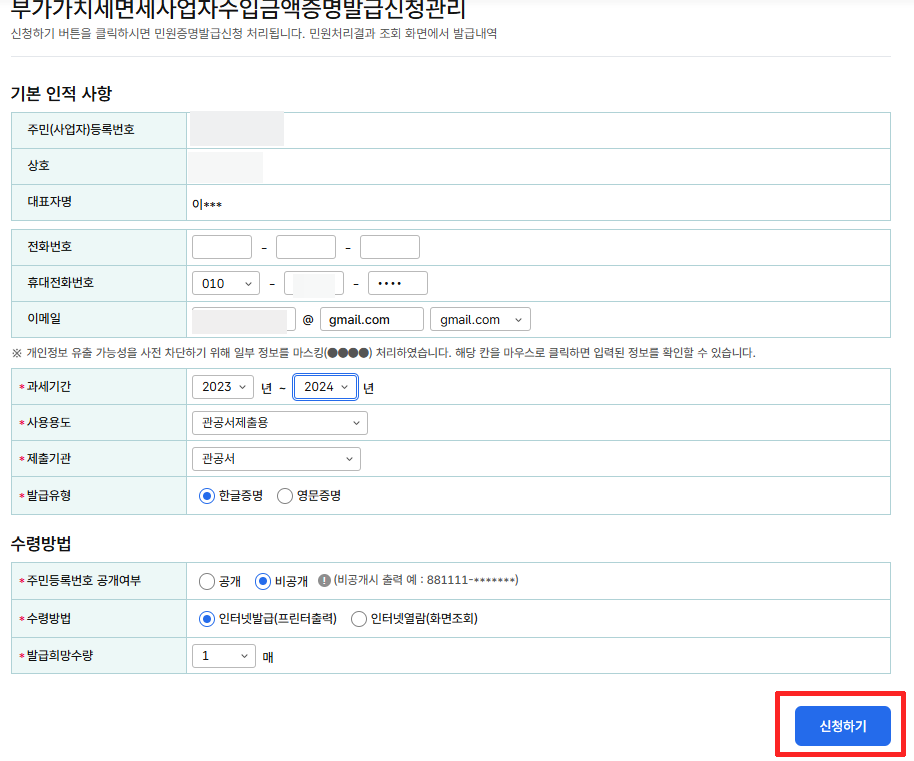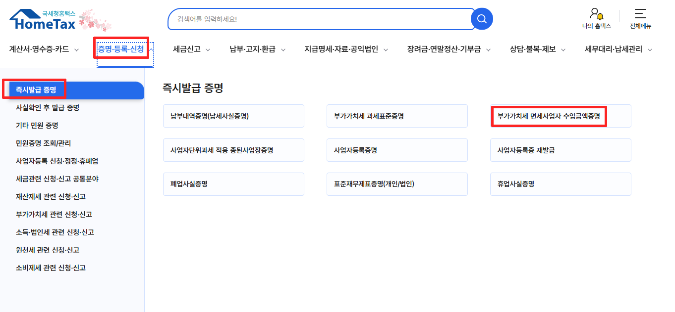 증명.등록.신청 → 즉시발급 증명 → 부가가치세 면세사업자 수입금액증명