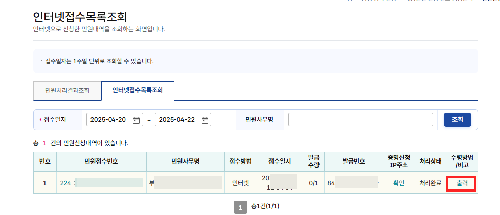 인터넷접수목록조회에서 출력 진행해주시면 됩니다.
