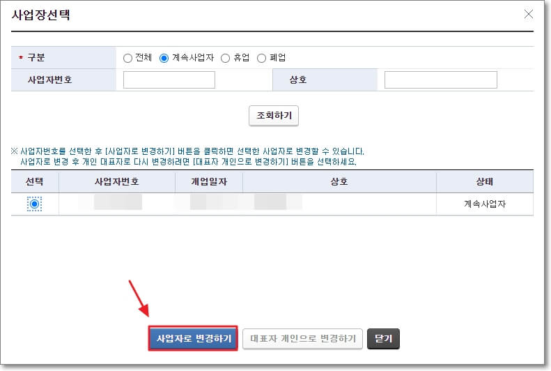 "사업장 선택" 창이 뜨죠? 여기서 사업용 신용카드 매입세액 공제 확인 및 변경을 할 사업자를 선택한 후, 하단의 "사업자로 변경하기" 버튼을 클릭합니다.
