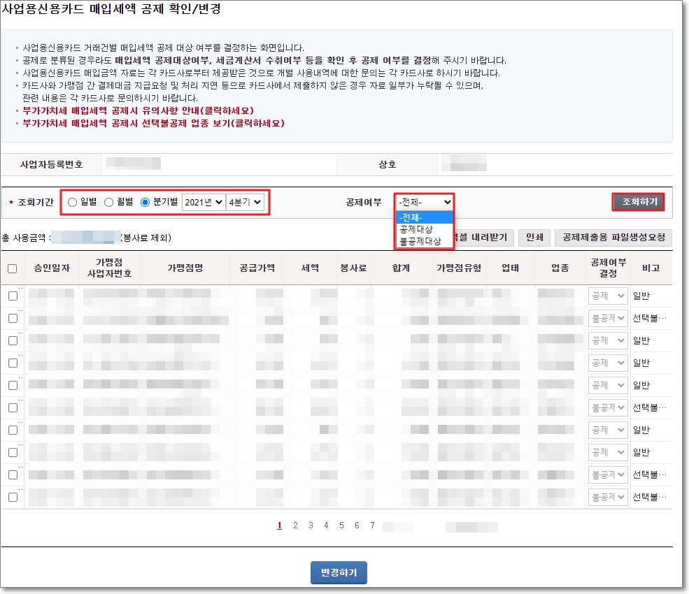 사업용 신용카드 매입세액 공제 확인 및 변경 페이지입니다. 조회기간을 "분기별"로 표시하면 훨씬 더 편하게 작업을 할 수 있습니다.