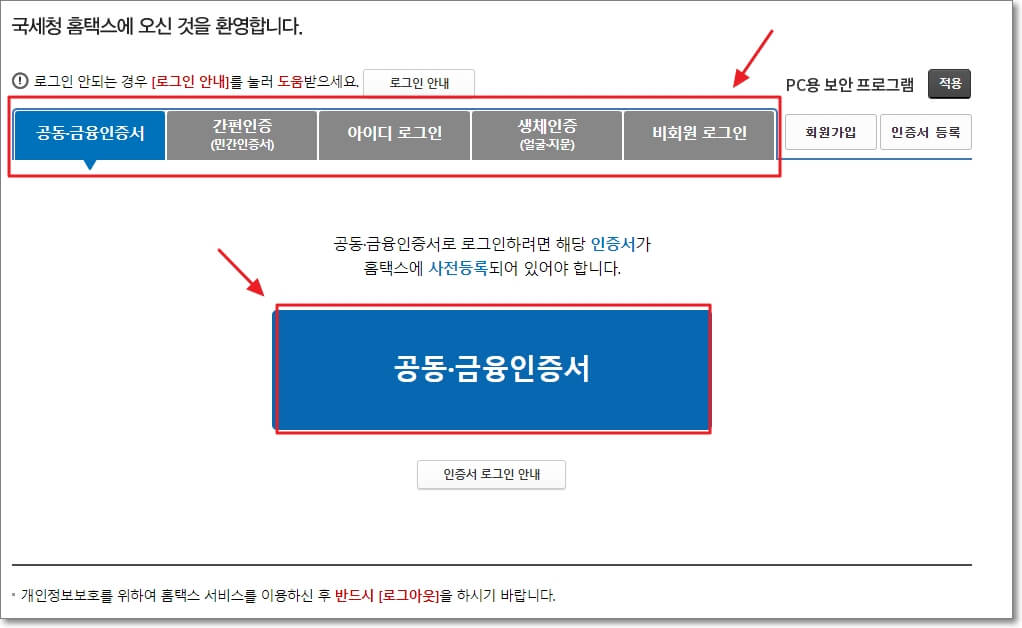 홈택스에 로그인을 하는 방법은 총 5가지가 있습니다.