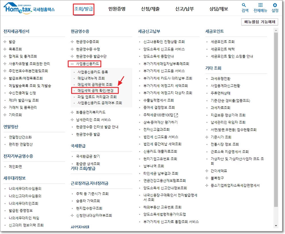 홈택스의 상단 메뉴 중, "조회/발급 → 현금영수증 → 사업용 신용카드 → 매입세액 공제 확인/변경"을 클릭합니다.
