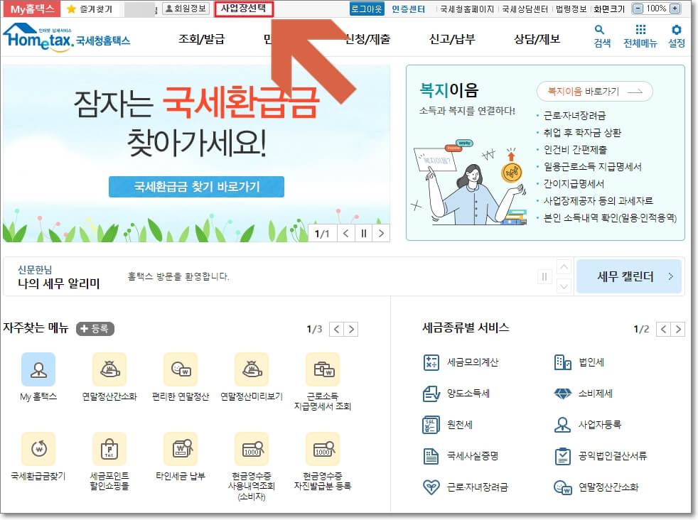 홈택스에 로그인을 하고, 다시 홈택스 홈페이지에 나오면, 상단에 "사업장 선택" 버튼이 생겨있을 것입니다.