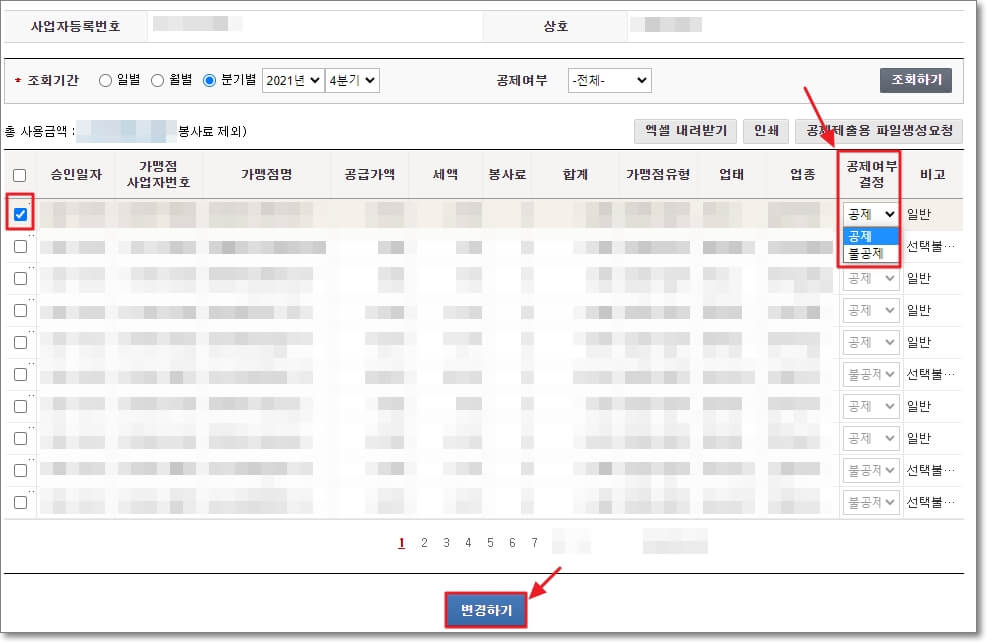 공제 여부를 변경하는 방법은 변경하고 싶은 결제 내역의 체크 박스(제일 왼쪽 부분)에 체크를 하고, 오른쪽의 "공제 여부 결정"을 공제 또는 불공제로 변경하면 됩니다.