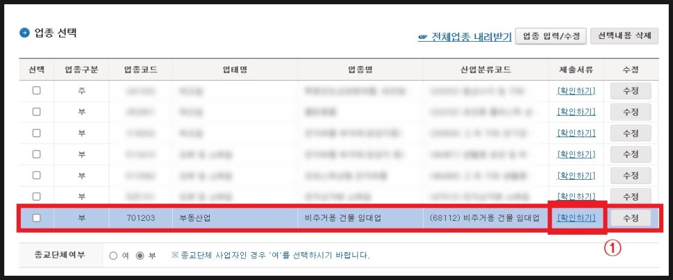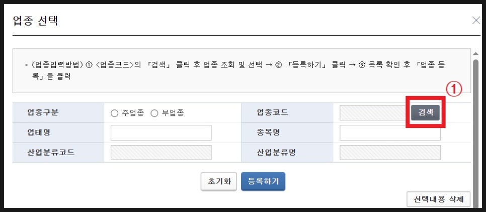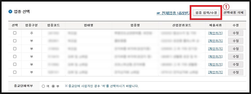 ✔ 반대로 '업종삭제' 하려는 분들은 해당 업종코드 선택해 준 뒤