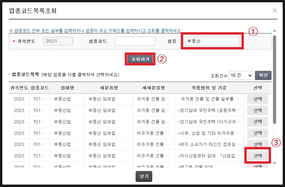 그리고 ‘업종코드목록'에서 해당되는 코드 찾은 후 ③ [선택] 눌러줍니다.
