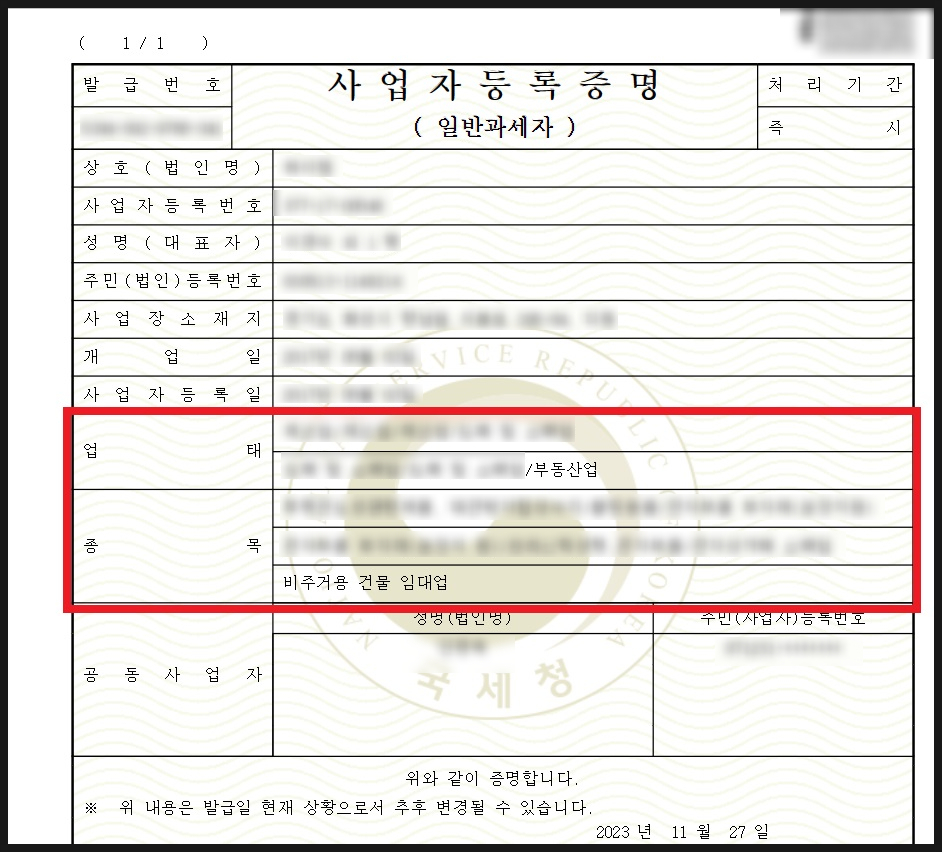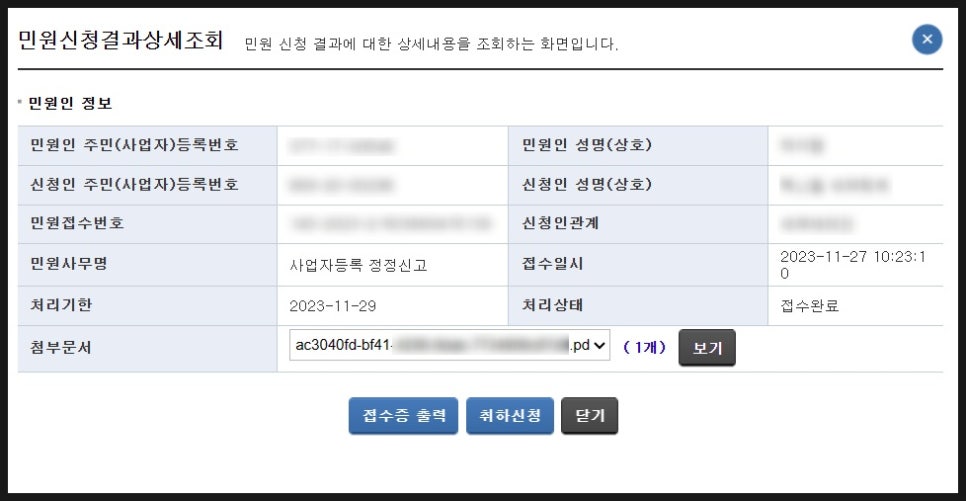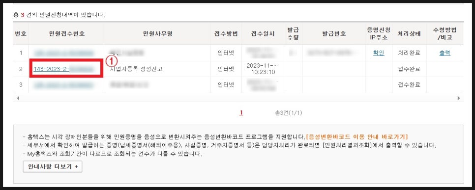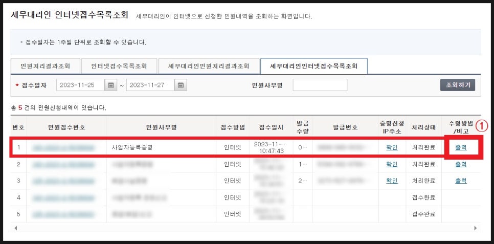 처리 완료 후 세무서 방문하셔서 사업자등록증 수령하실 분들은