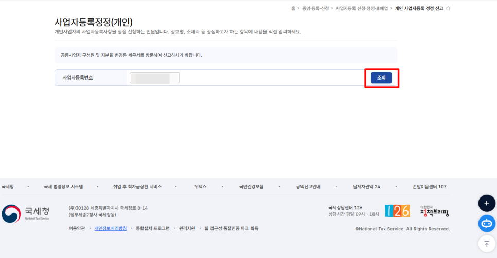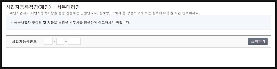 이곳에서 개인사업자 '사업자등록증 정정'하는 건데,