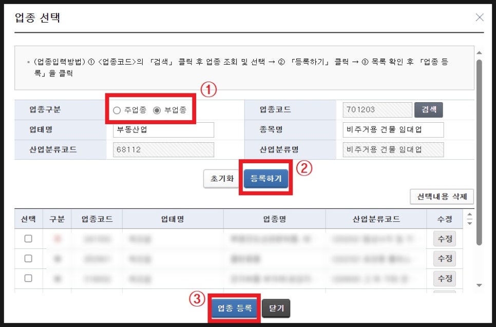 마지막으로 ③ [업종등록] 클릭해줍니다.