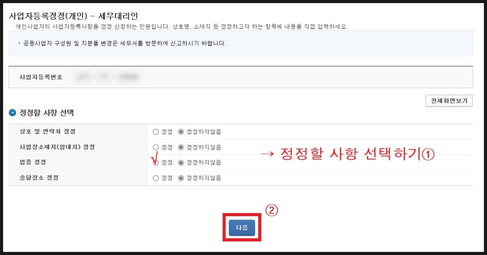① [업종 정정] 체크 후 ② [다음] 눌러줍니다.