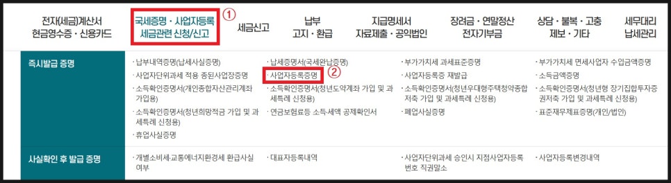 상단에 ① [국세증명·사업자등록 세금 관련 신청/신고] 탭에 커서만 올려주고,
