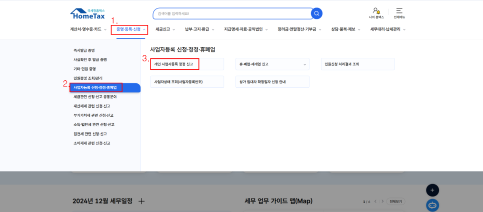 그리고 ② [사업자등록 신청.정정 .휴폐업] - [개인 사업자등록 정정 신고] 클릭해주세요.