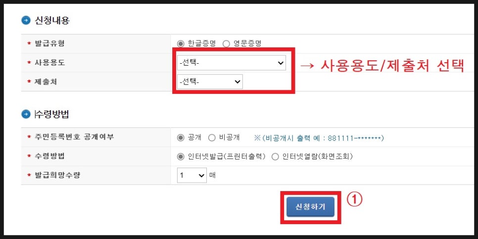 ① [민원접수번호] 클릭해서 '접수증 출력' 후 '신분증' 들고