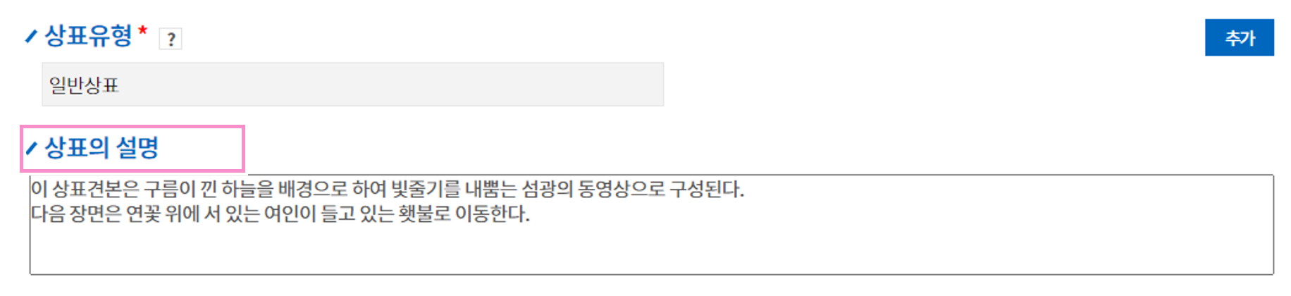 상표의 설명은 예시를 가져왔고, 상표에 대한 설명을 간단하게 작성해주면 된다.
