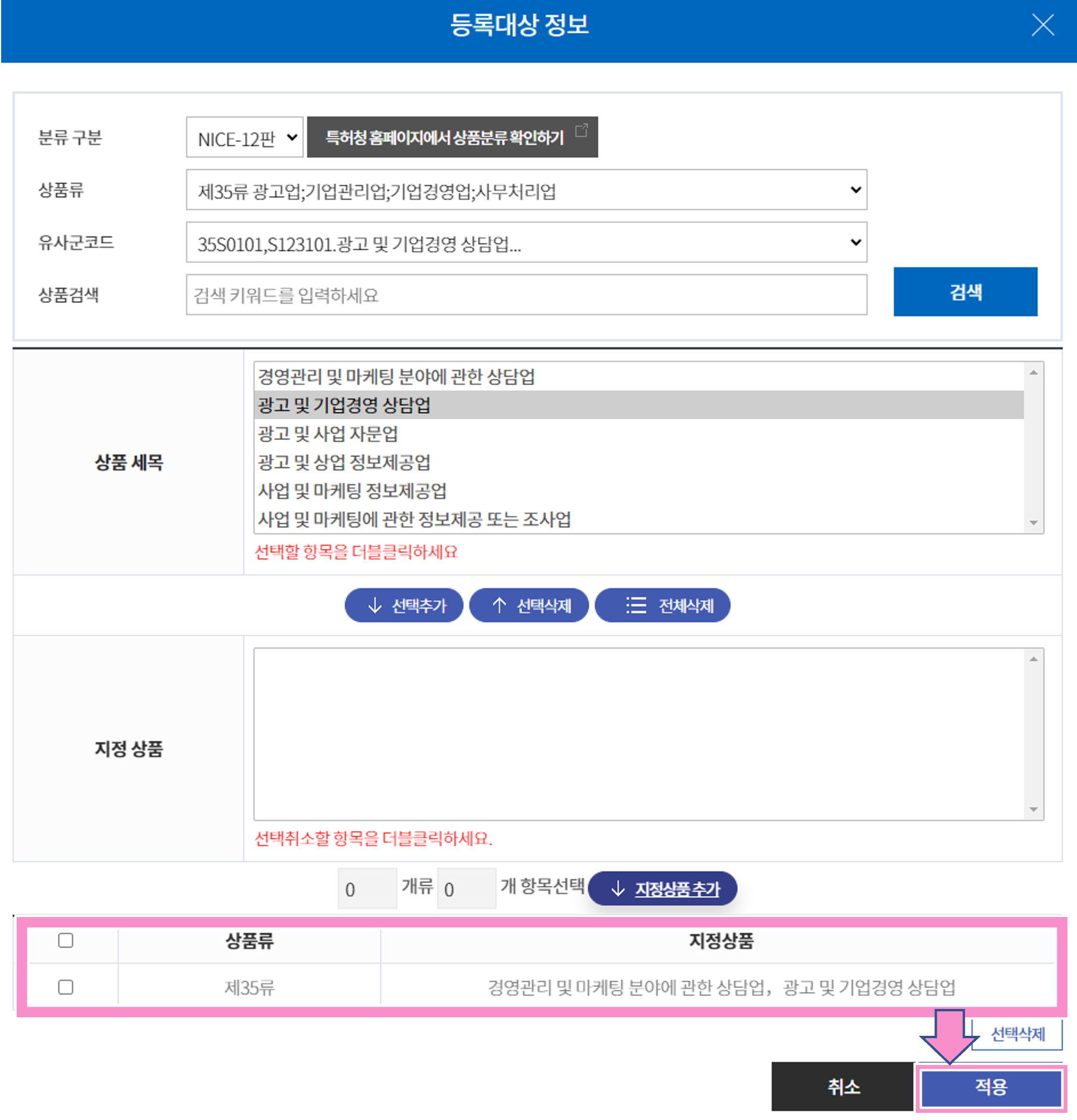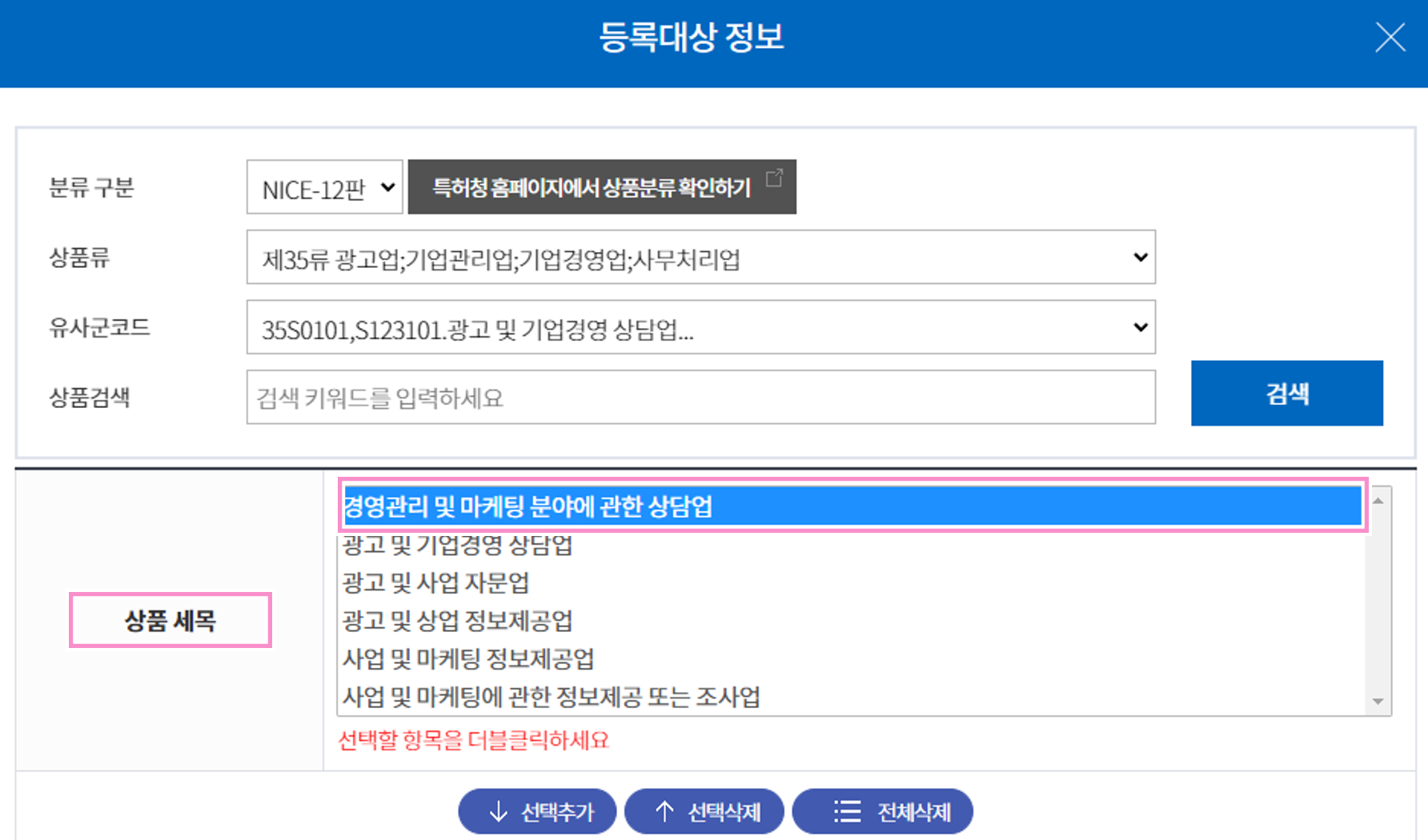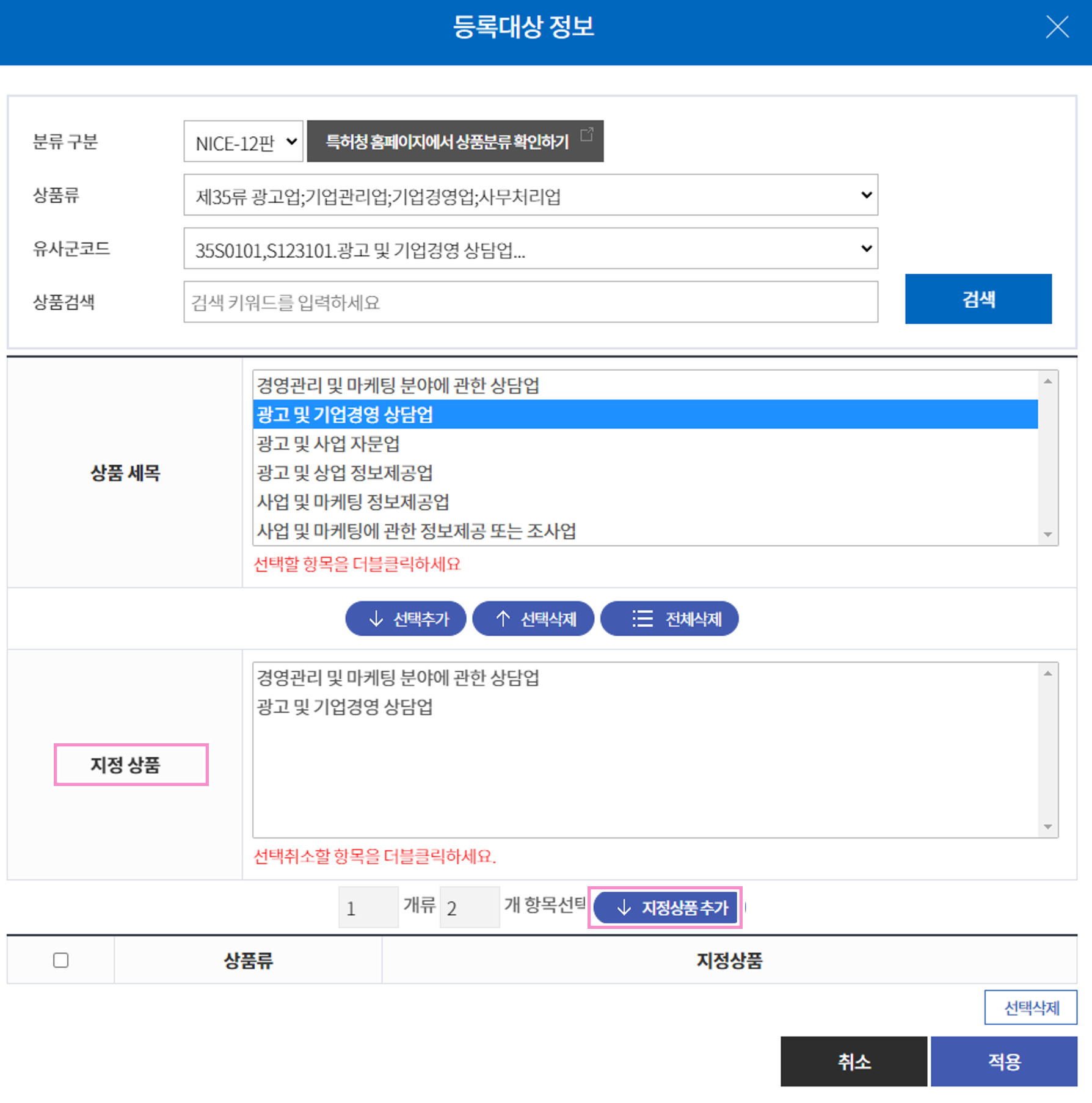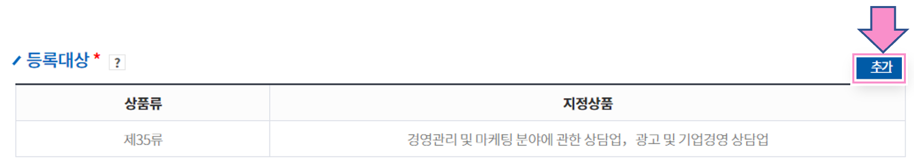 선택한 제35류 이외에 다른 상품류도 추가하려면 '추가' 버튼을 클릭해서 추가하면 된다.