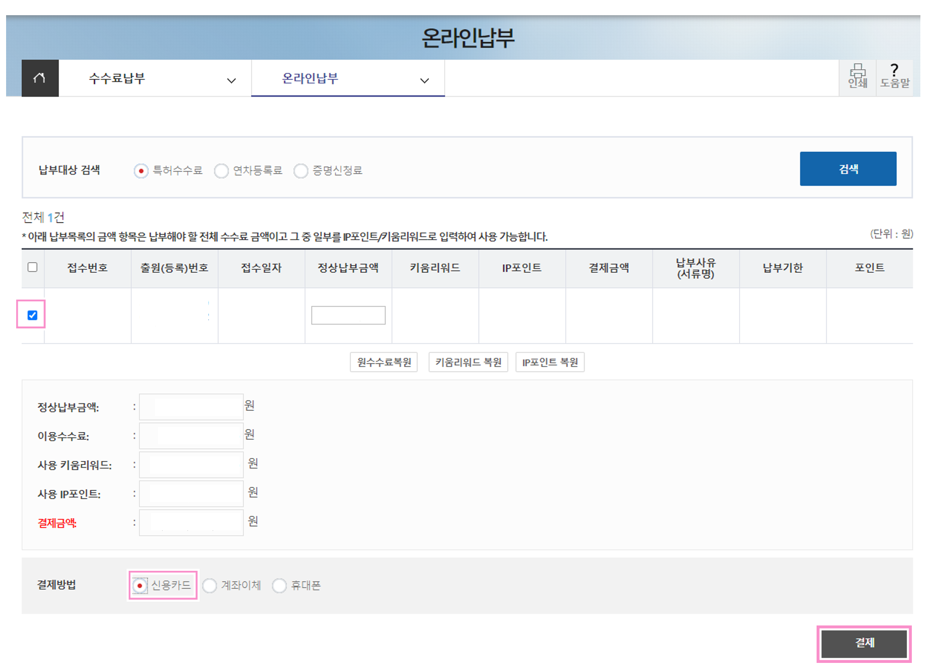 제출을 완료했으면 이제 수수료를 납부해보자.