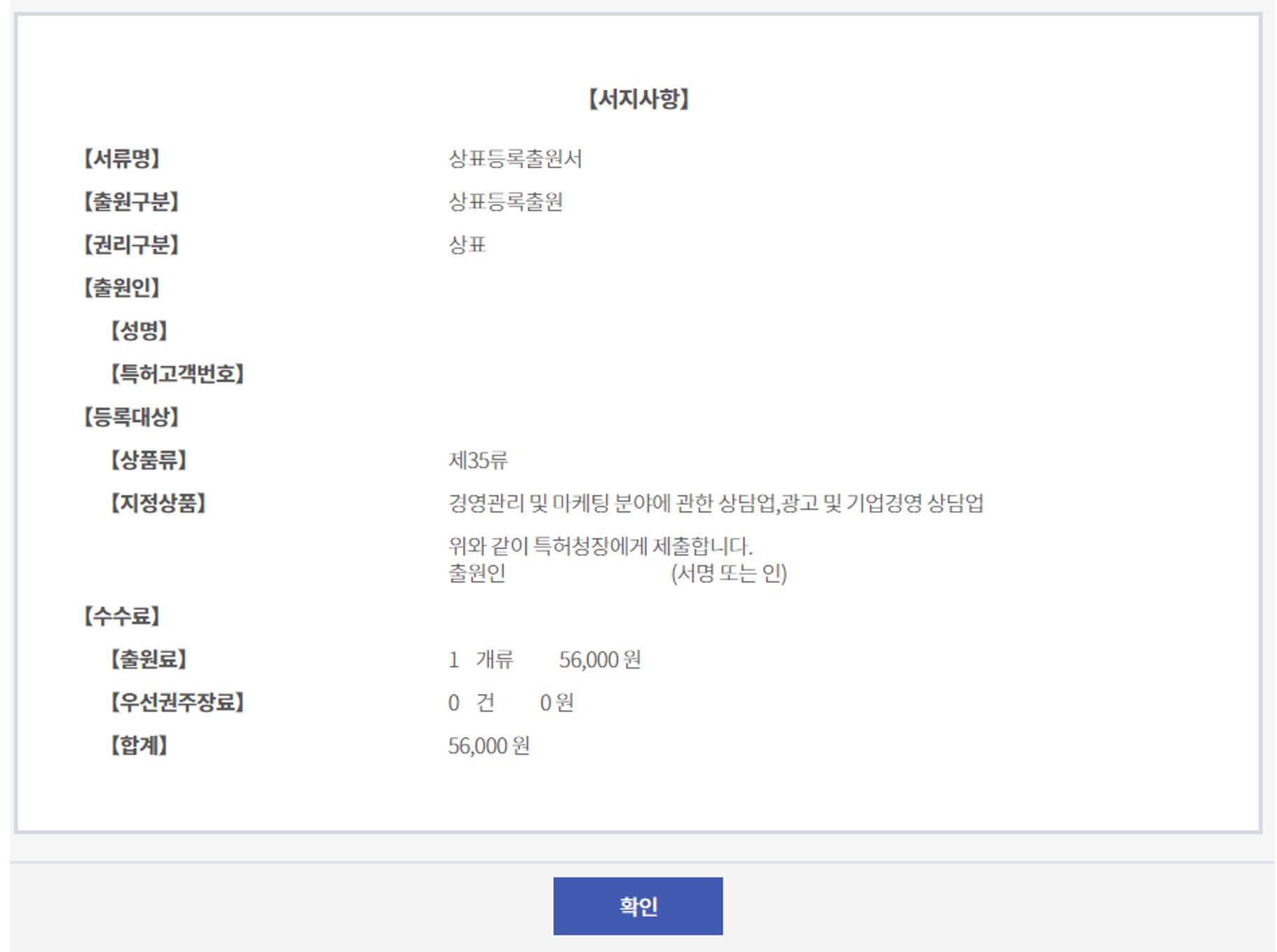 (참고로 상품류 1개당 지정 상품은 20개까지 56,000원으로 동일한 금액이고, 20개를 초과하면 1개당 2,000원의 가산금이 발생한다.)
