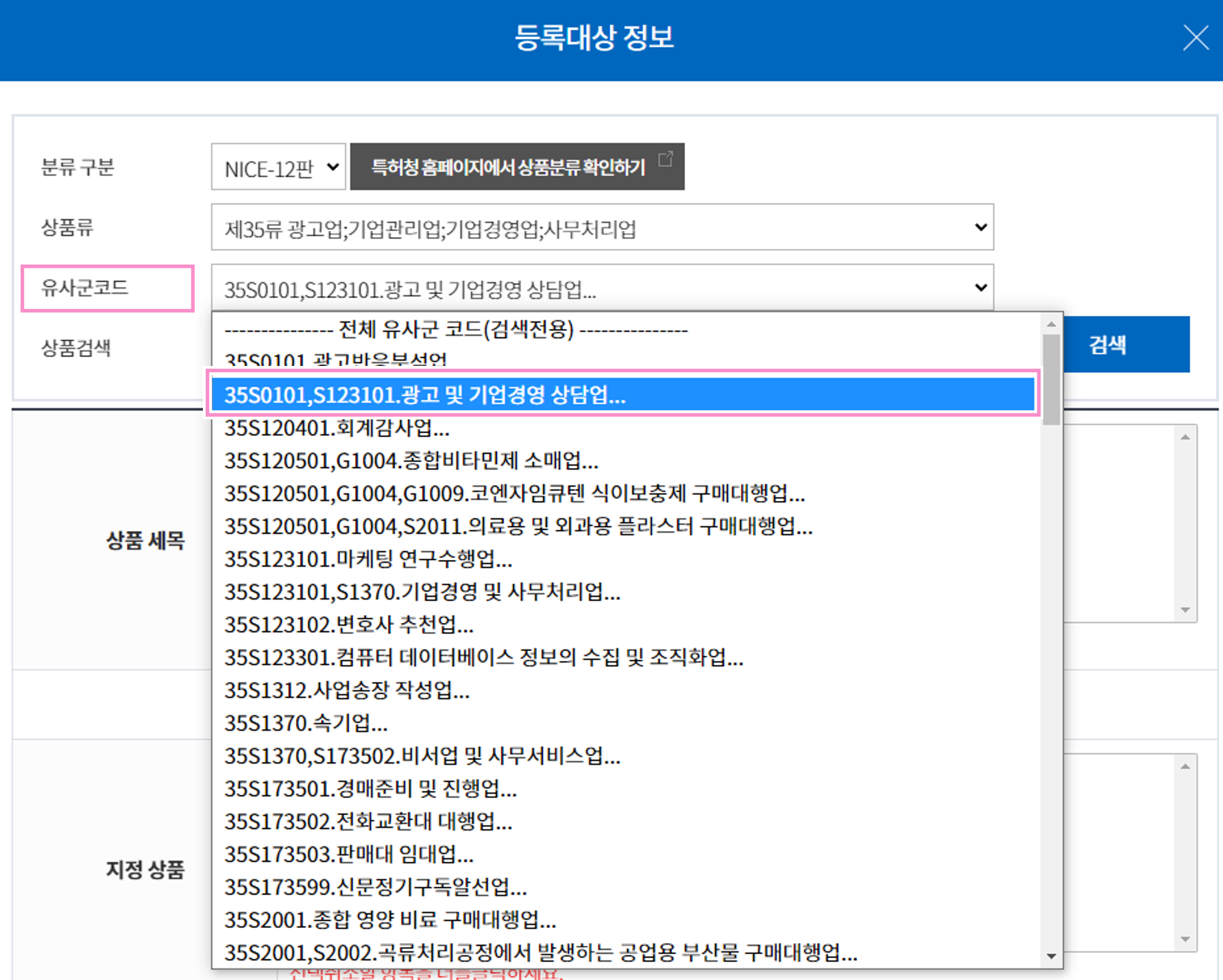 선택한 상품류에 해당하는 유사군코드 목록이 보여진다.
