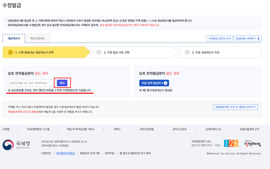 해당 화면에서 승인번호를 모르는 경우 아래 네모친 세금계산서 조회하기 클릭합니다.