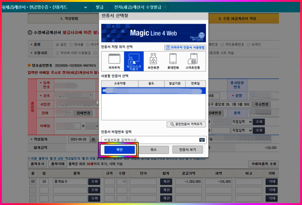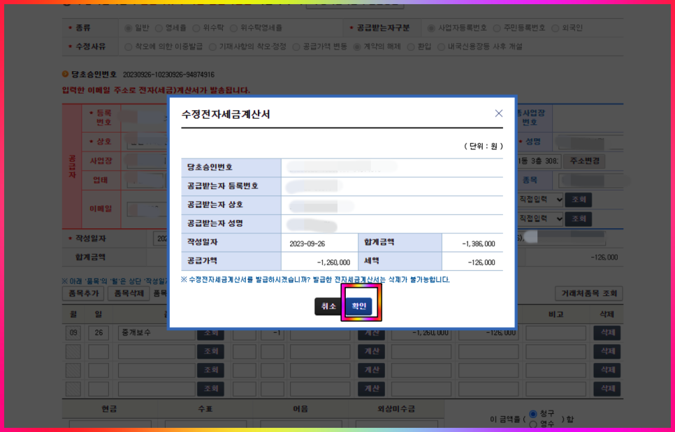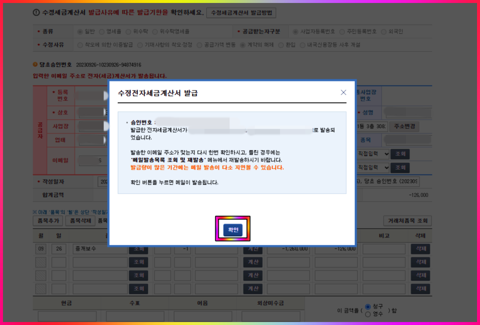 위 인증절차를 마치면 수정전자세금계산서 발급 확인 팝업 창이 나타납니다.
