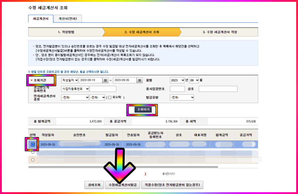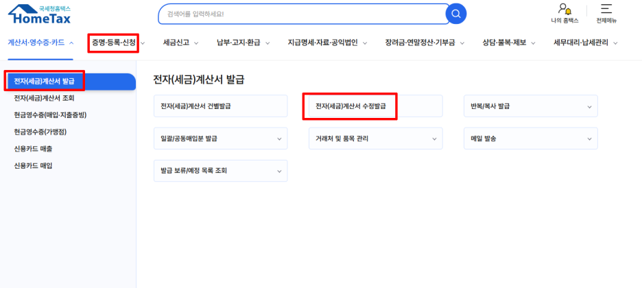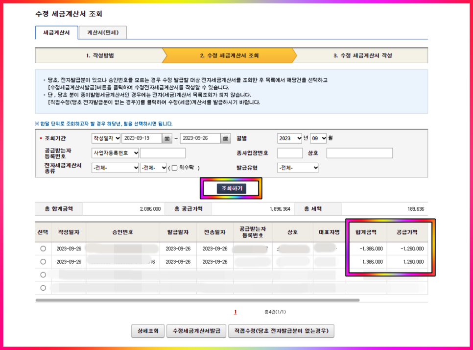 끝으로 수정 세금계산서가 잘 발급되었는지 수정 세금계산서 조회 화면으로 이동해 확인해 보겠습니다.