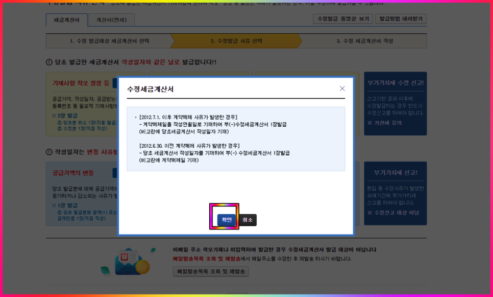2012년 7월 1일 이후 계약해제 사유가 발생한 경우 비고란에 당초세금계산서 작성일자를 기재하라고 나와있지만, 수정발급 시 자동으로 입력되므로, 무시하고 확인 버튼 클릭합니다.