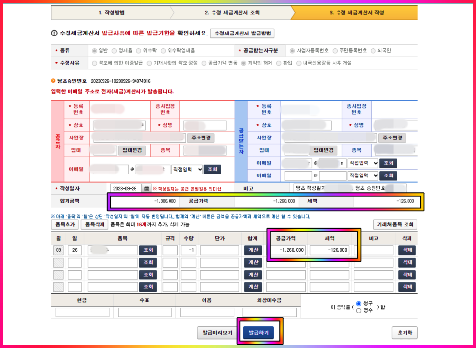 아래 사진에서 확인할 수 있듯이 처음 발행한 합계금액과 공급가액 모두 마이너스 처리되어 있음을 확인할 수 있습니다.