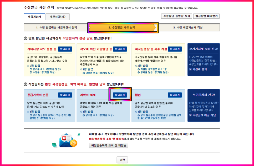 위 카테고리 클릭하면 수정 발급대상 세금계산서 선택 화면으로 이동합니다.