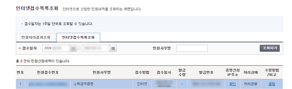 인터넷 접수 목록에서 신청한 민원을 확인해보시면 소득금액증명원 발급 완료
