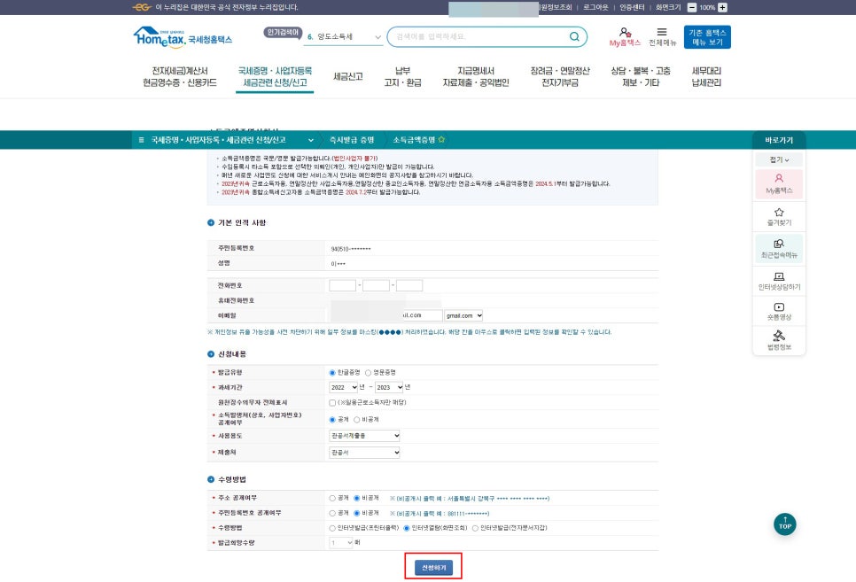 그리고 발급 유형, 과세 기간, 일용근로소득자 해당여부, 소득 발생처, 용도, 제출처를 선택하고 주소와 주민등록번호 공개여부 및 수령 방법을 선택하고 '신청하기'를 누른다.