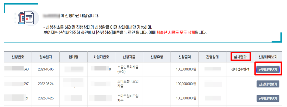센터접수 반려 시 신청내역보기 클릭해주세요.