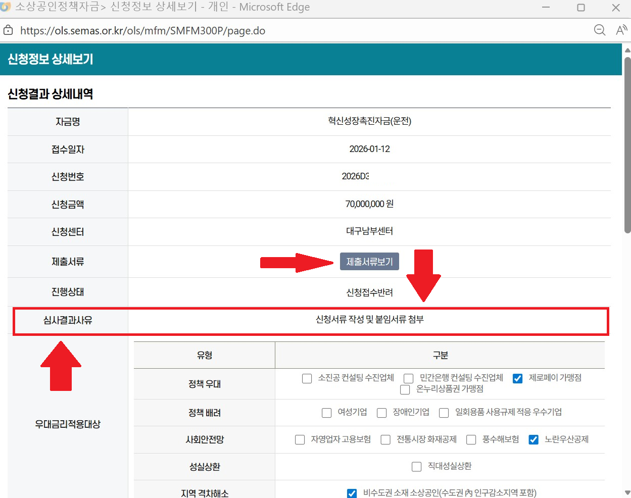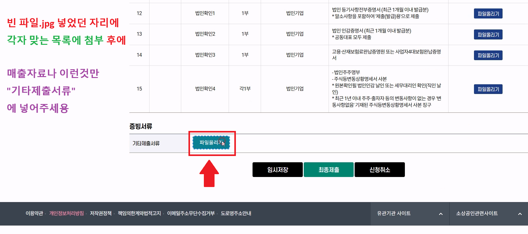 반려 문자 & 전화를 받았을 때 서류 보완'카카오 톡방`에"사유 캡쳐 해서 보내주고 반려됐어요" 라고 보내주세요.1. 로그인 - 나의대출 - 대출신청결과2. 대출신청결과 - 직접대출신청결과 - 심사결과3. '센터접수반려' 클릭하면 사유 나옵니다.캡쳐해서 보내주세요!B. 직접 보완 하는 방법1. 신청내역 보기 클릭2. 화면 내린 후 신청서 작성페이지 이동3. 화면 내려서 "예" 클릭4. 이 화면으로 이동되면 화면 내리기5. "빈 파일.jpg" 첨부했던 곳에 파일 직접 올리기6. 매출자료나 ERP 자료나 키오스크 등 스마트 자료는 "기타제출서류"에 넣기6. 최종제출 확인 ㄱㄱㄱ - 카톡방에 했다고 말해주기카톡방에 보완 해주세요!