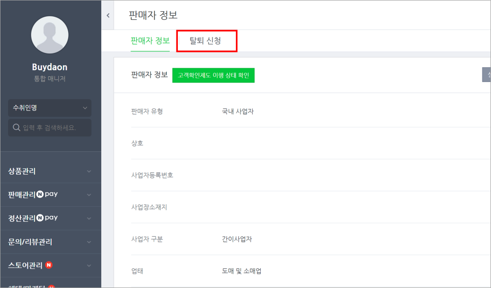 그럼 다시 판매자 정보-판매자 정보-탈퇴하기로 가면 아래 탈퇴하기 버튼이 활성화됩니다.