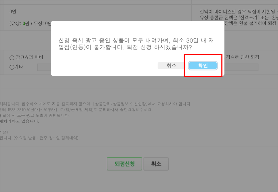 자꾸 정말 퇴점할 거냐고 물어보지만 가차없이 확인을 누릅니다.