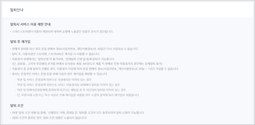 탈퇴가 되면 동일 판매자 정보(사업자번호, 개인식별정보)로 30일간 재가입이 불가합니다.