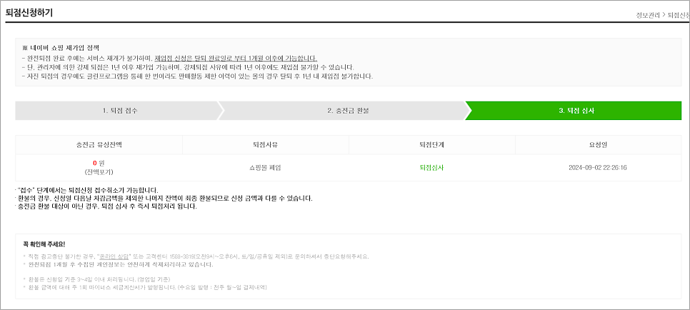 네이버에서 심사 후 퇴점이 진행됩니다.