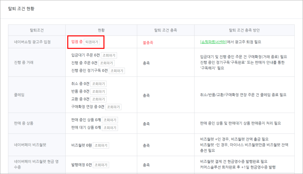 퇴점하기 전 아래 탈퇴 조건이 충족되어야 합니다.